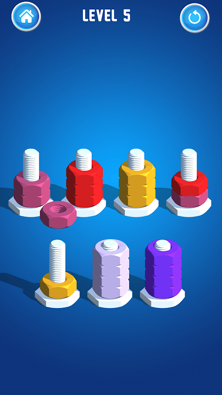 Sort the colored nuts on the bolts until all colors are sorted on each bolt. This is a challenging game, yet extremely satisfying. Have fun and relieve your stress at the same time!