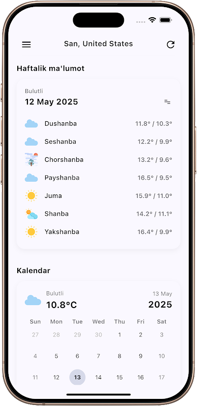 • Oddiy kalendardan sanani tanlang va o‘sha kungi ob-havoni to‘liq ko‘ring.