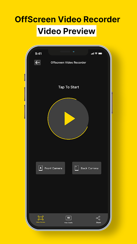 يقوم تطبيق Video Recorder بتسجيل الفيديو خارج الشاشة بالعديد من أحجام المعاينة مثل الصغيرة والمتوسطة والكبيرة وبدون معاينة. يستخدم هذا التطبيق أيضًا كاميرا فيديو خلفية لتسجيل الفيديو بجودات فيديو متعددة مثل 214P و480P و720P و1080P.