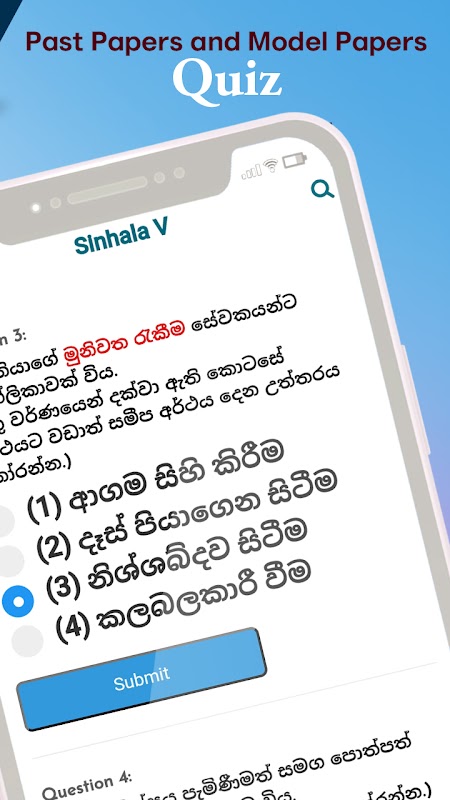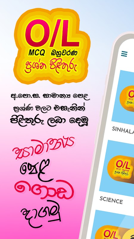 අ.පො.ස. සාමාන්ය පෙළ බහුවරණ (MCQ) ප්රශ්ණ සඳහා පිළිතුරු ලබා දී එසැනින් හරි වැරදි බලා ගැනීමේ පහසුව මෙම යෙදුම තුළින් ලබා දේ. පසුගිය ප්රශ්ණ පත්ර හා ආදර්ශ ප්රශ්ණ පත්ර බහුවරණ (MCQ) ප්රශ්ණ අන්තර් ගත වේ.
