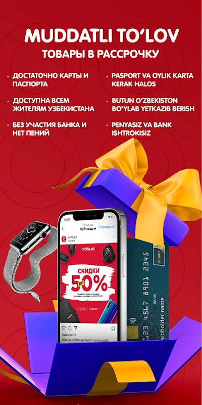 • إمكانية شراء البضائع بالتقسيط (الائتمان) في جميع أنحاء أوزبكستان.