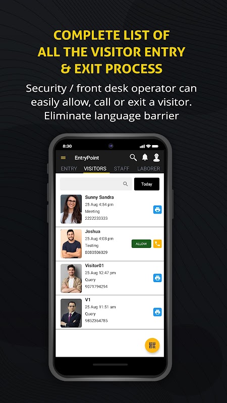 EntryPoint هو نظام إدارة زوار قابل للتخصيص وغني بالميزات يسجل ويتتبع جميع عمليات الدخول والخروج بسرعة. يقوم برقمنة إدارة جميع فئات الزوار - الضيوف والموظفين والتدبير المنزلي والباعة والعمال وما إلى ذلك.