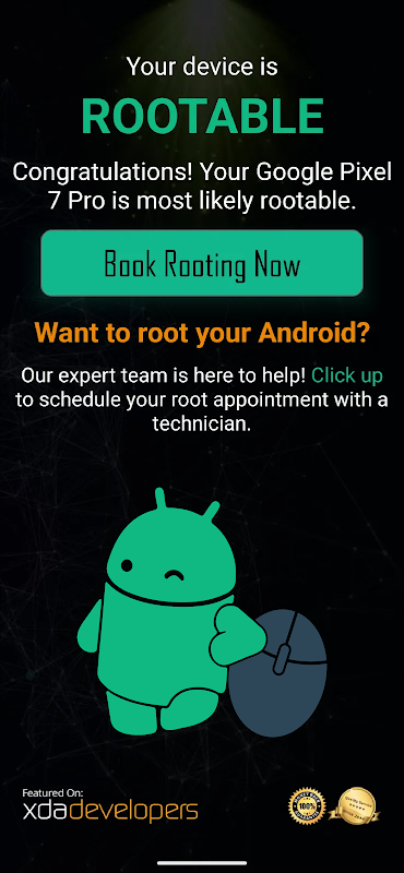 إذا كنت أحد المحظوظين واكتشفت أن جهاز Android الخاص بك قابل للتجذير، فيمكنك النقر فوق الزر "Book Rooting Now" لتحديد موعد جلسة تجذير مع أحد خبرائنا.