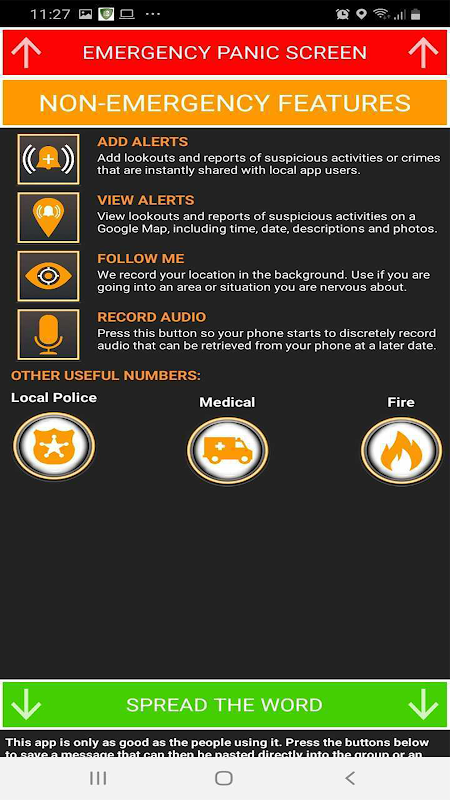 - سيرسل هاتفك رسائل sms إلى ما يصل إلى 5 أشخاص قمت بتحديدهم عند التسجيل. سيتمكنون من رؤية موقعك بالضبط في الوقت الحقيقي.