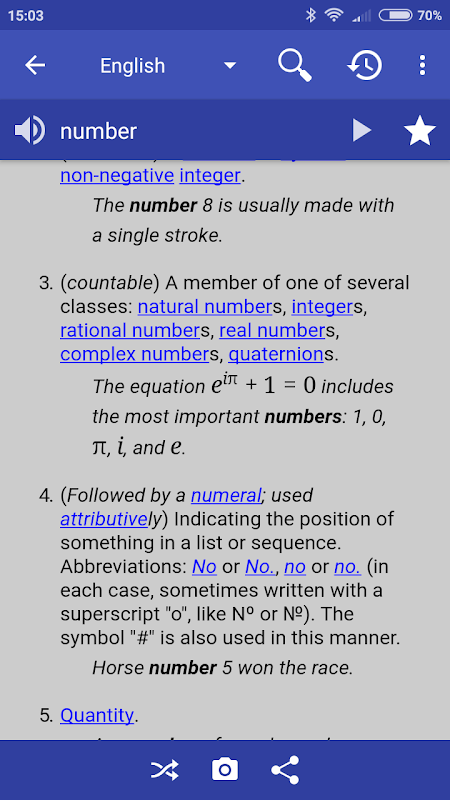 يمكنك الاستماع إلى نطق الكلمة، بشرط أن تكون البيانات الصوتية مثبتة في هاتفك (محرك تحويل النص إلى كلام).