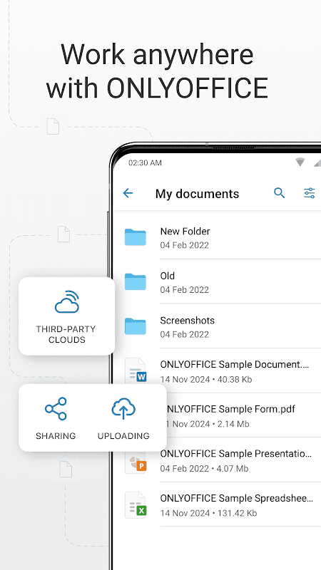 تطبيق ONLYOFFICE Documents هو تطبيق مجاني للعمل على المستندات المكتبية. يمكنك الوصول بسهولة وإدارة الملفات المخزنة في سحابة ONLYOFFICE. تعاون على المستندات مع زملائك. قم بعرض، إدارة وتحرير الملفات المحلية.