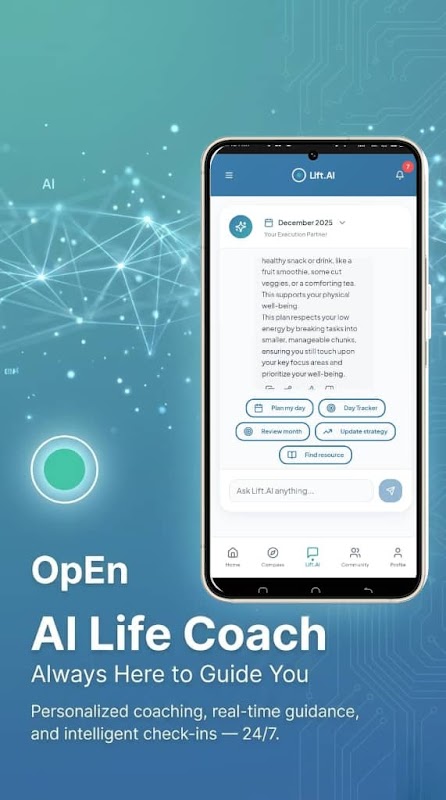بالإضافة إلى Lift.AI، مساعدنا الذكي للتنفيذ، ستحصل على شريك نجاح يومي يساعدك على التخطيط، والتركيز، واتخاذ الإجراءات تلقائيًا.