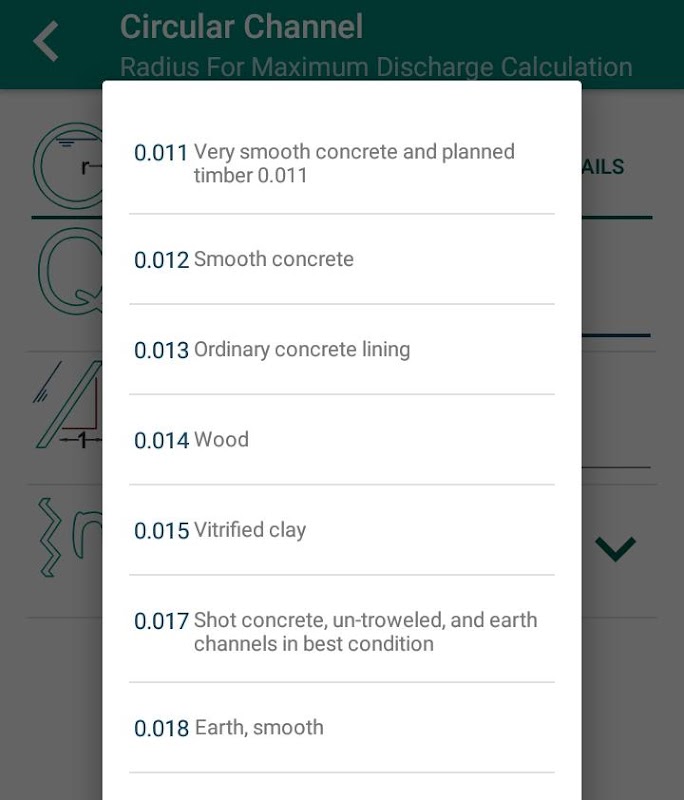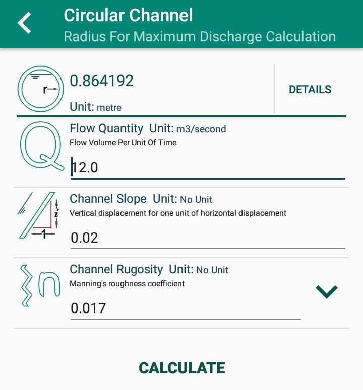 قناة دائرية: تدفق الكمية، الشعاع، الشعاع على إبراء الذمة الحد الأقصى، الشعاع للسرعة القصوى، قناة العمق الخالي، المنحدر القناة، المنحدر قناة لتصريف الحد الأقصى، المنحدر قناة للسرعة القصوى.