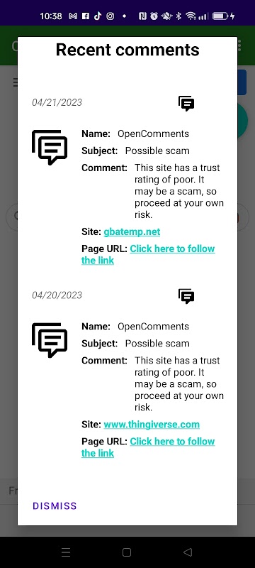 3. احصل على إشعارات بشأن مواقع الويب الاحتيالية المحتملة. عندما تنتقل إلى موقع لا يعرفه OpenComments بالفعل، سيقوم التطبيق بالبحث في الإنترنت عن معلومات قد تشير إلى أن الموقع عبارة عن عملية احتيال ويحذرك تلقائيًا. بالإضافة إلى ذلك، يمكن لمستخدمي OpenComments الآخرين نشر تجاربهم الخاصة مع الموقع.