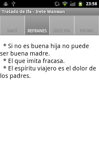 نسخة للمحترفين من معاهدة ايفا. تطبيق ممتاز وكامل تفاعلي indentificar Odduns 256 ايفا مع ثنائي وكتابة السيناريو اليوروبا. وبالإضافة إلى ذلك معرفة معلومات مفصلة من كل علامة، الذي ينقسم إلى 4 أقسام: الولادة اقوال وايفا يقول باتاكي. مع الصلوات، Ebboces والتوصيات وEshu، سر الأشغال، وقصص جمعها من كل الميزات Oddun.