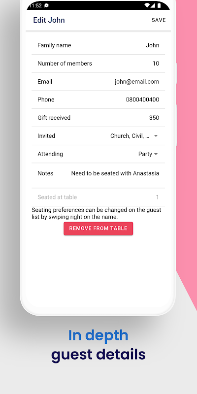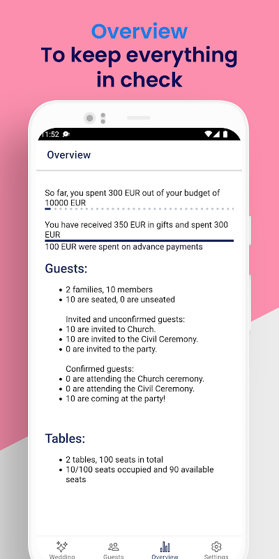 · وقسم نظرة عامة حيث يمكنك ، في لمحة ، عرض بيانات مثل إنفاقك بالنسبة إلى الميزانية ، والضيف الكامل وحالة الطاولة في حفل الزفاف (الضيوف الجالسون أو غير المقعدون ، وعدد المقاعد الموجودة في المجموع ، وعدد الضيوف مدعوون إلى ماذا وكم سيحضرون أي حفل زفاف ، وأكثر من ذلك)