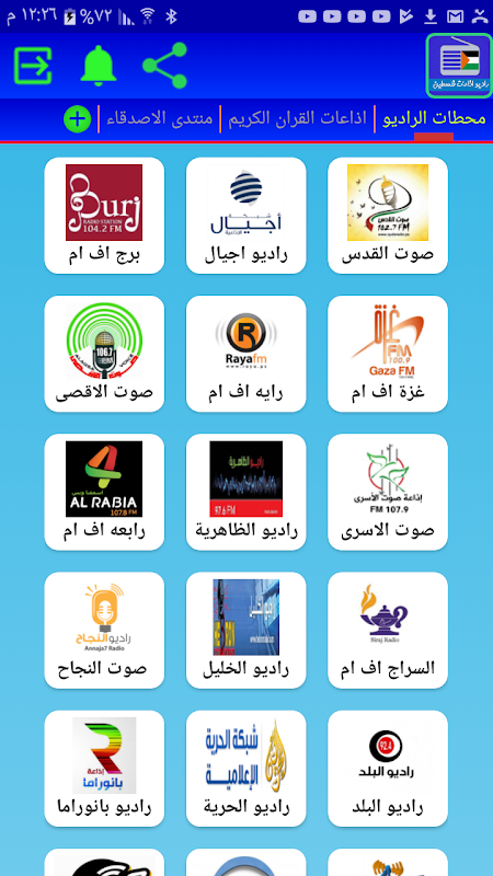 اذاعات فلسطين جميعها في تطبيق واحد وبحجم صغير لاياخذ مساحة كبيرة من جهازك بالاضافة لاذاعات القران الكريم ومنتدي للتواصل بين اعضاء التطبيق ومن بين الاذاعات الموجودة نذكر لكم بعضها من محطات راديو فلسطين مثل