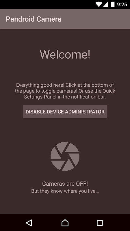 يستخدم كاميرا Pandroid وAPI إدارة الأجهزة لمعرفة هاتفك أن استخدام الكاميرات محظور تماما. يمكنك تمكين وتعطيل الكاميرات في التطبيق، أو إذا كنت على نوكا أو أكثر، يمكنك استخدام إعدادات البلاط سريع.