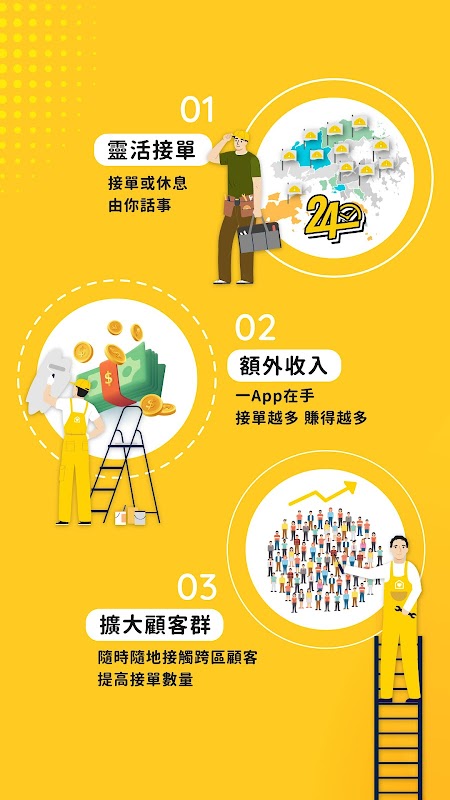 مع وجود تطبيق في متناول اليد ، من السهل كسب دخل إضافي. لا يتطلب الأمر سوى ثلاث خطوات للاتصال بالعملاء في 18 منطقة في أي وقت وفي أي مكان ، وزيادة عدد الطلبات المستلمة ، وإرسال عروض أسعار صيانة المنزل / الهندسة على الفور!
