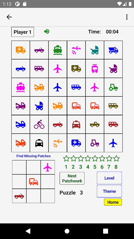 هناك ثلاثة مستويات من الصعوبة مضمنة في التطبيق. يستخدم المستوى 1 لحاف مجنون كبير بحجم 6 × 6 ، مما يجعل من السهل نسبيًا مطابقة نمط الترقيع [3 × 3]. يستخدم المستوى 2 لحاف مجنون 8 × 8 ؛ المستوى 3 يستخدم لحاف 10 × 10. لا تمثل المستويات الأعلى بالضرورة مستوى صعوبة أعلى ، ولكن من المحتمل أن يستغرق الأمر وقتًا أطول قليلاً للعثور على النمط. حجم الترقيع [3x3] هو نفسه على جميع المستويات.