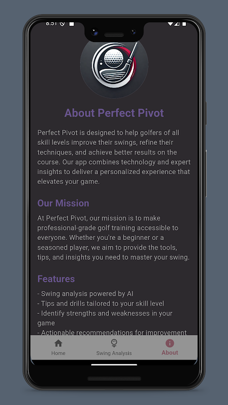 يُعد Perfect Pivot الرفيق المثالي للاعبي الجولف من جميع مستويات المهارة، وهو مصمم لمساعدتك على تحسين تأرجحك وتحسين أسلوبك وخفض درجاتك. سواء كنت لاعبًا مبتدئًا أو ذا خبرة، يستخدم تطبيقنا تقنية الذكاء الاصطناعي المتطورة لتوفير تحليل التأرجح المخصص وردود الفعل القابلة للتنفيذ ونصائح الخبراء للارتقاء بلعبتك إلى المستوى التالي.