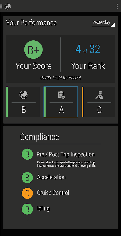 - وسجل السائقين على الجوانب التالية من سلوك القيادة الخاصة بهم: الترقب. تسارع قاسية والتباطؤ. الكبح القاسي. السرعة والانعطاف الحاد.