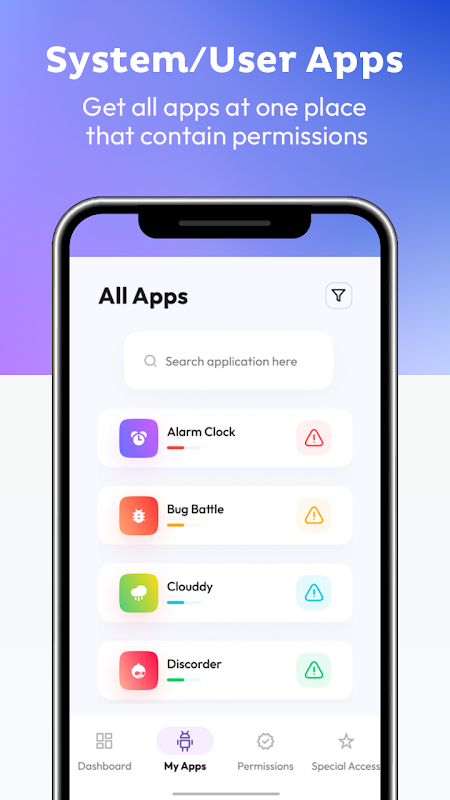 تتيح لك الميزات السهلة لتطبيقاتي على لوحة المعلومات قائمة التحكم في أذونات التطبيق لجميع تطبيقات الطرف الثالث لمراقبة مخاطر الأذونات والطبيعة المرتبطة بكل تطبيق مثبت.