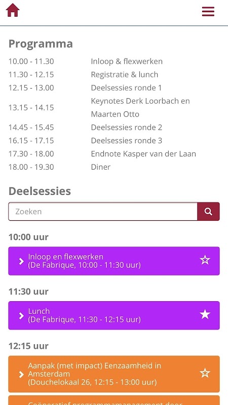 - Het overzicht van alle deelsessies en de mogelijkheid om de sessies op te slaan, om zo je eigen favoriete programma samen te stellen.