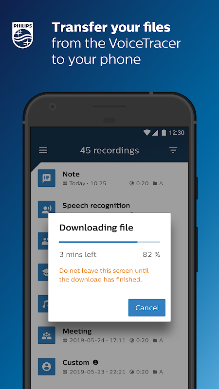 قم بنقل التسجيلات الخاصة بك مباشرة من Philips VoiceTracer إلى هاتفك الذكي عبر Wi-Fi لتشغيلها ومشاركتها على الفور مع الأصدقاء والعائلة باستخدام هذا التطبيق المريح.