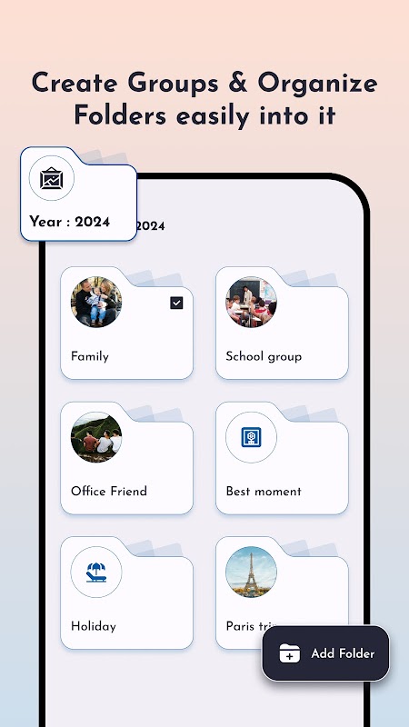 قم بتنظيم صورك بسهولة واحتفظ بذكرياتك مع هذا التطبيق! يعد هذا التطبيق مثاليًا لإنشاء المجلدات وإدارتها وتجميعها، ويضمن تنظيم صورك دائمًا وسهولة الوصول إليها.