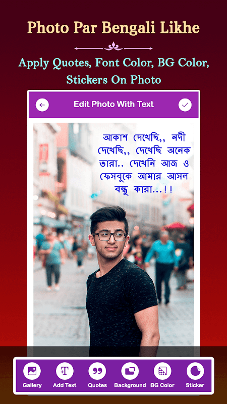 ছবিতে বাংলা পাঠ লিখুন give opportunity to write Bengali love poetry, Bengali poems, Bengali gazals and Bengali shayari on photo by Bengali typing on photo app.also you can select best quotes from different categories of quotes like friends quotes, attitude quotes, inspirational quotes, love quotes etc.in Bengali language and set on your photo.