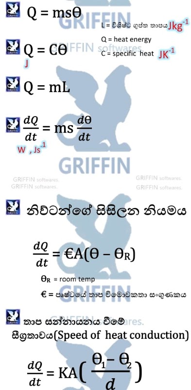 උසස් පෙළ භෞතික විද්යා විෂය නිර්දේශයට අයත් සියලු සමීකරණ (සම්මත එකකද සහිතව) විදිමත්ව වර්ගීකරණය කර මෙය නිර්මාණය ඇත.ඉංග්රීසි මාධ්යය හෝ සිංහල මාධ්යය ඔස්සේ අද්යාපනය හදාරන සිසුන්ට මෙන්ම විශ්වවිද්යාල සිසුන්ටද මෙම التطبيق එක උපකාරී වේ.