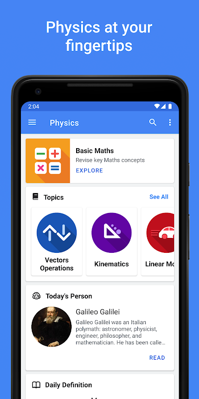 ابحث عن أي شيء تريد معرفته واستكشف عالم الفيزياء. يمكن للمستخدمين البحث في الموضوعات والتعريفات والصيغ والفيزيائيين للحصول على النتائج على الفور.