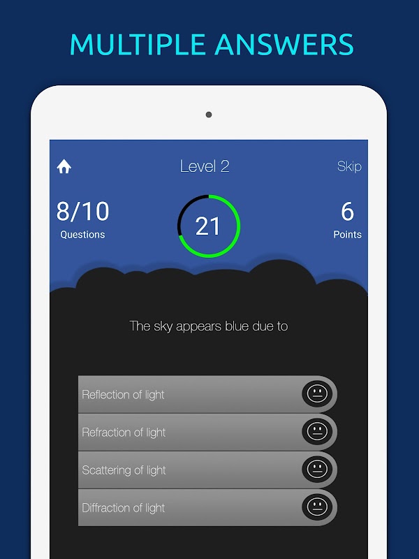 يتم تبديل الأسئلة والإجابات عشوائيًا في كل مرة تلعب فيها. يمكنك تخطي سؤال ، إذا كنت لا تعرف الإجابة. لعب متعددة واحدة على واحد مع أصدقائك!