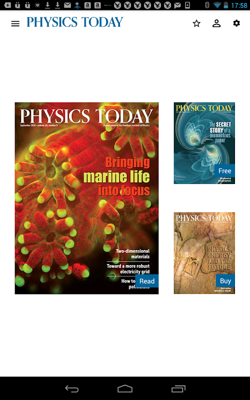 The Physics Today app provides each month's magazine content in an advertising-free format. Monthly and annual subscriptions are available, or you can purchase individual issues.