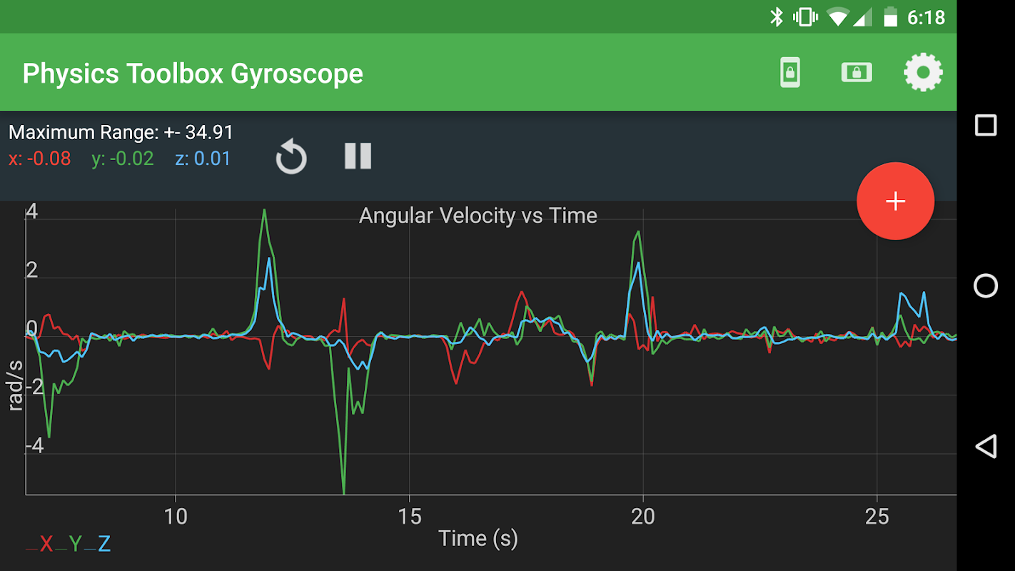 This app measures and displays a graph of Angular Velocity (rad/s) vs. Time (s) that can be exported to Google Drive or in an e-mail as a .txt attachment with comma separated values (csv). This gyroscope can be used to measure rotational and/or periodic changes in the x, y, and z planes.
