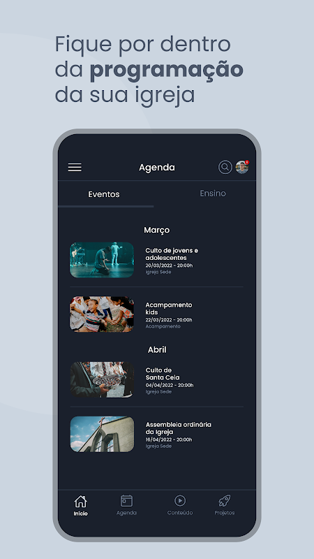 الموارد المتاحة في التطبيق: الأخبار ، أجندة الكنيسة ، الأحداث ، المحتويات ، المشاريع ، البث المباشر ووحدة التدريس.
