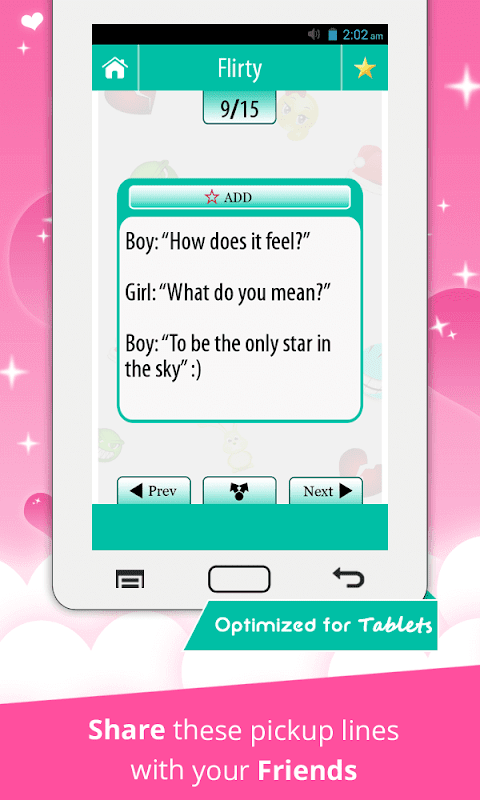 Whether be it lines full of love, emotional repute, naughty flirts or hilarious jokes. We have it all in this one-of-a-kind app for Pickup Lines and Flirty Jokes. Find the most funny, cheesy, humorous, sleazy, nerdy and weird Pickup lines on Android market. It’s a huge collection of one-liners and jokes that will help you in picking up guys and girls and engage in friendly romantic conversations.