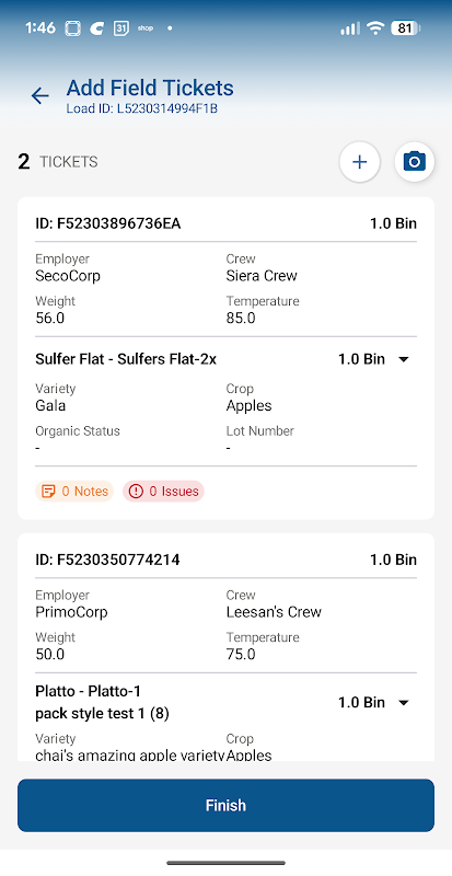 مع PickTrace Receiving، يُمكن لأطقم العمل إضافة منصات نقالة أو تذاكر ميدانية مُعدّة مسبقًا إلى الحمولة بسرعة، وتحديث الحالات، وإدارة جميع العمليات اللوجستية في مكان واحد. عند الحاجة، يُمكن للمستخدمين أيضًا إنشاء منصات نقالة جديدة مباشرةً من التطبيق، مما يضمن سير العمليات بسلاسة. الإمكانات الرئيسية