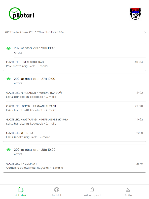 يسمح هذا التطبيق للأندية والقضاة في اتحاد الباسك بيلوتا في ألافا ، واتحاد الباسك بيلوتا في بيزكايا ، واتحاد الباسك بيلوتا في جيبوزكوا واتحاد الباسك بيلوتا في إقليم الباسك بتنفيذ عمليات مختلفة.