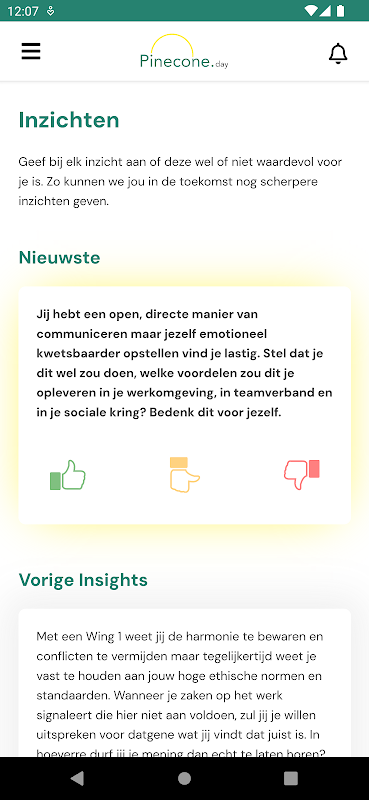 يعرض تطبيق Pinecone رؤى للمستخدم بناءً على التقييمات المكتملة، مما يسمح له بالتعرف على نفسه بشكل أفضل. الأشياء التي يجيدونها، أو يجدون صعوبة فيها. دوافعهم للقيام أو عدم القيام بأشياء معينة، وما إلى ذلك.