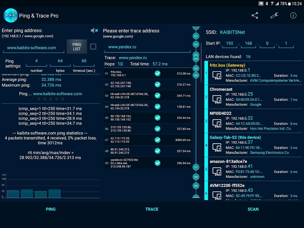 Ping and Trace Pro is a powerful tool to measures the ICMP echo or shows the trace from any host address or host name. For example, www.google.com or 192.168.0.1. The results can quickly be shared (Dropbox, Google Drive, Evernote ...) as a text file (Ping results) or as a .CSV file (Trace results) for e.g. Excel.