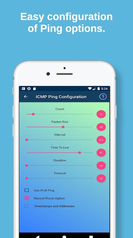تطبيق ICMP Ping هو أداة شبكة بسيطة ونظيفة لتشغيل أوامر ping من هاتفك أو جهازك اللوحي. هذه أداة Ping سهلة الاستخدام حيث يمكنك تشغيل أمر ping بعناوين IPv4 أو IPv6 أو استخدام اسم مضيف لخادم بعيد. بالنسبة للمستخدمين الأكثر تقدمًا ، يمكنك تعيين معلمات إضافية لأمر ping مثل الفاصل الزمني وحجم حزم ICMP وعدد الحزم و TTL وغيرها الكثير.