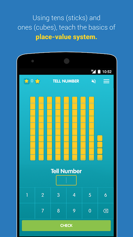 For Tell Number, the program shows a number of sticks (each stick represents a 10) and cubes (each cube represents 1). The child has to write the number with the number keyboard inside the app.