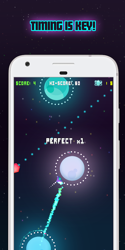انقر على الشاشة لتقفز إلى المدار. 🚀 حلِّق بين أنحاء المجرة، واقفز من كوكب إلى كوكب، وجمع السبيس بوكس أثناء تنقلك، وحاول تفادي الأقمار والجسيمات السماوية. ☄️