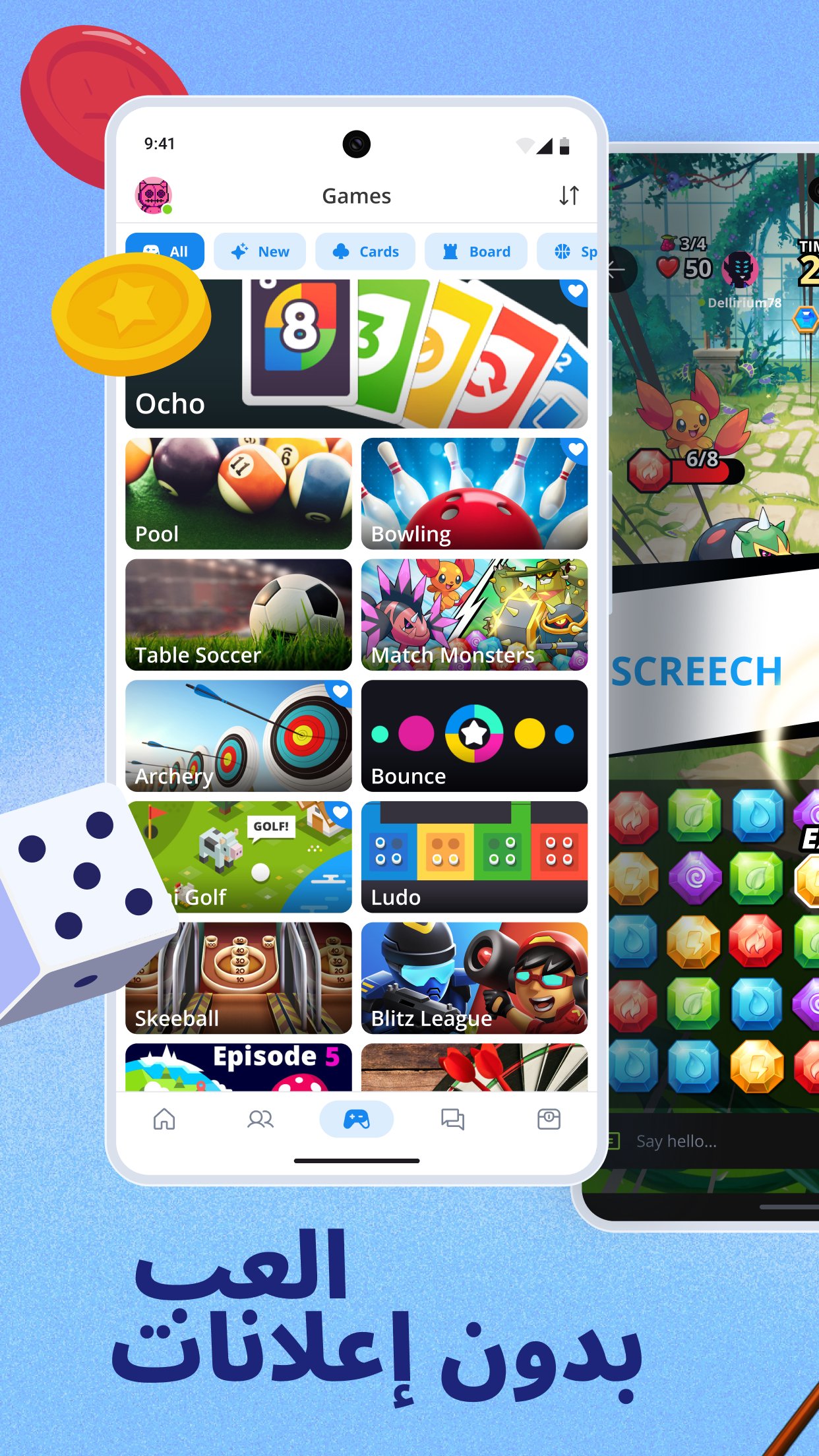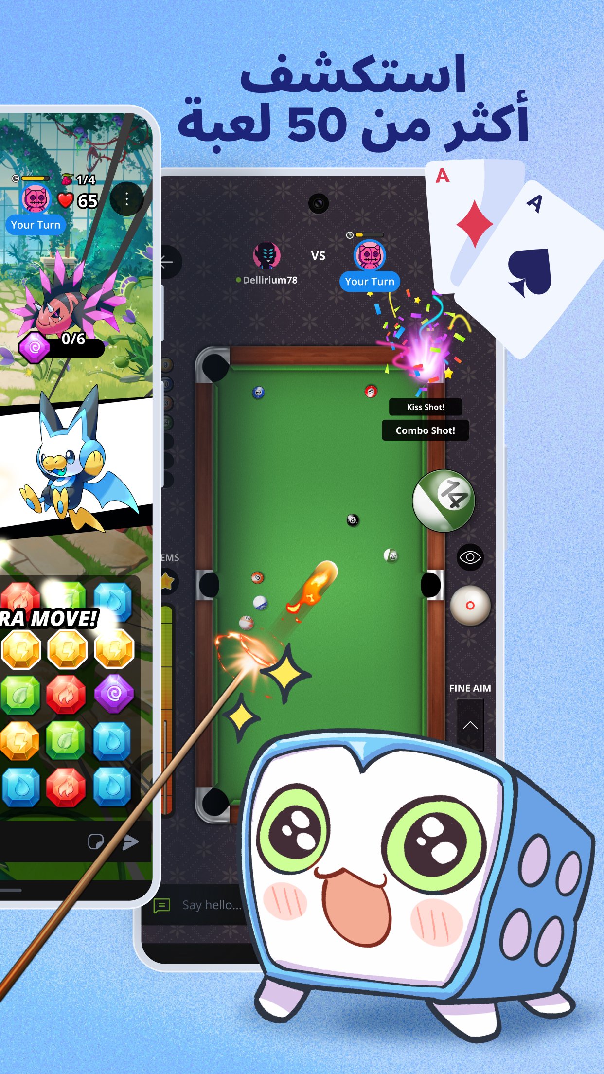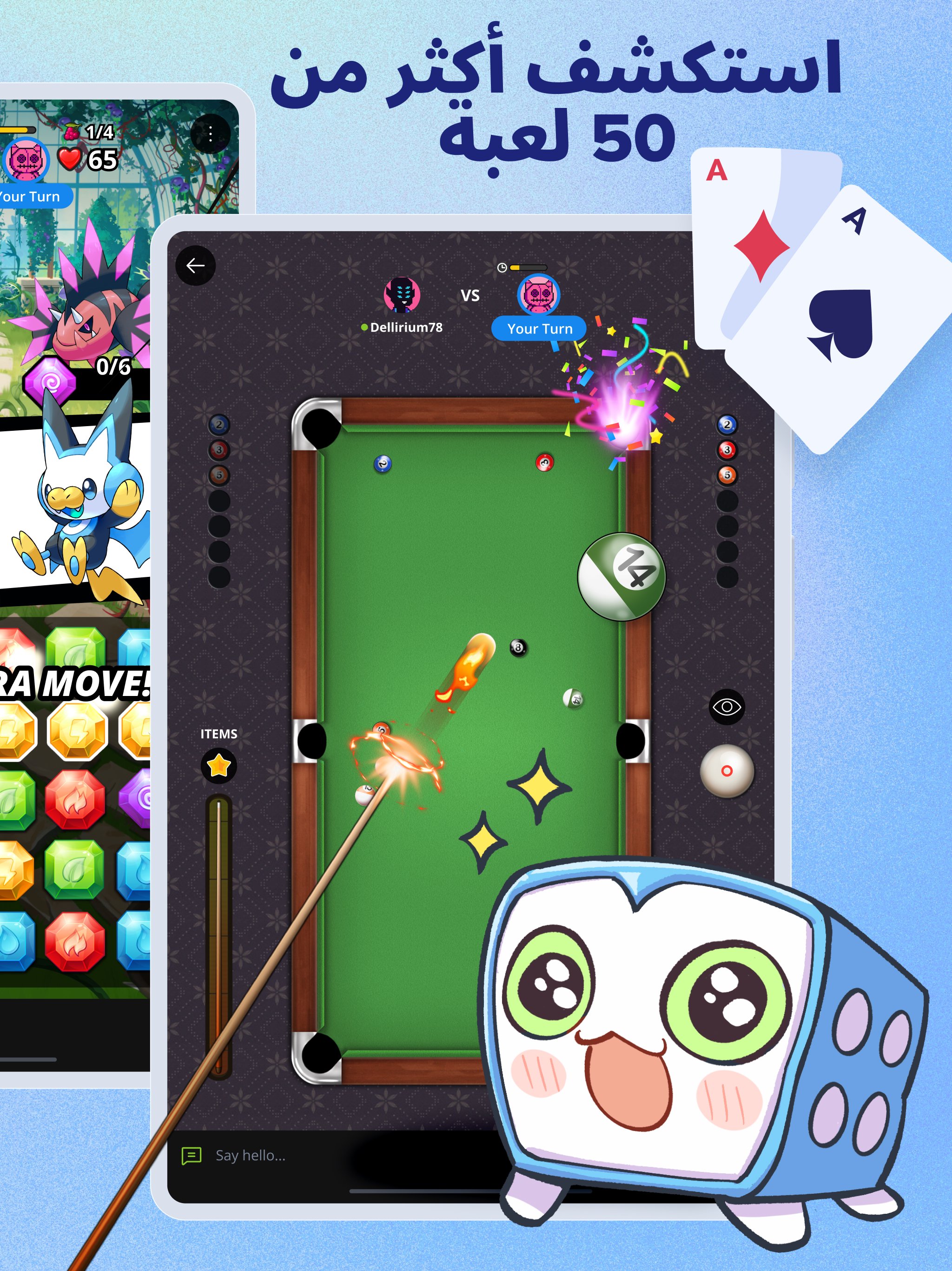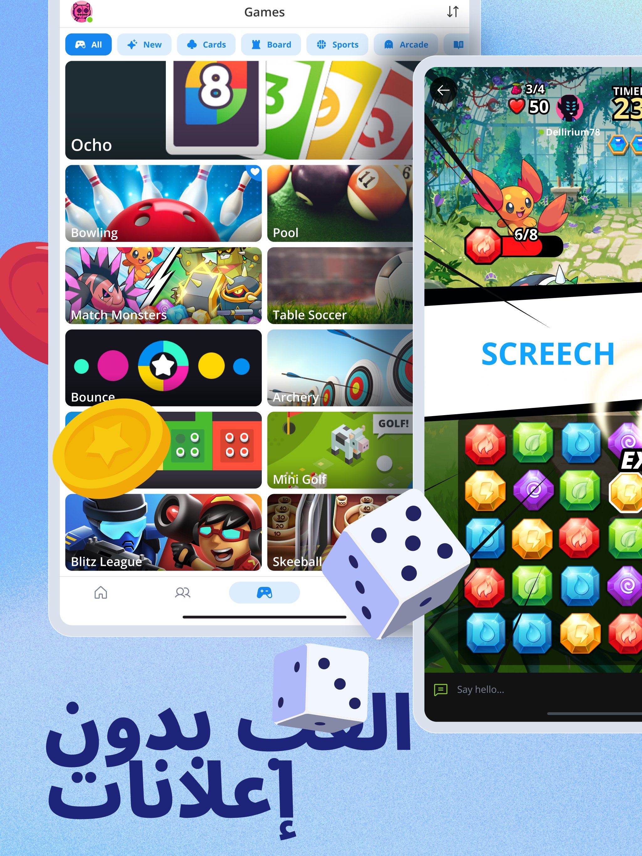 ● وفرة من الألعاب: مع وجود 50 لعبة متعددة اللاعبين من الدرجة الأولى مثل لعبة أوتشو (الثمانيات المجنونة) 8️⃣ أو البلياردو 🎱 أو البولنغ 🎳، هناك دائمًا شيء ممتع يمكنك أن تلعبه. سواء كنت من محبي الألعاب الإستراتيجية، أو الرياضية، أو ألعاب الطاولة الكلاسيكية، فنحن نوفر لك كل ما تحتاجه.