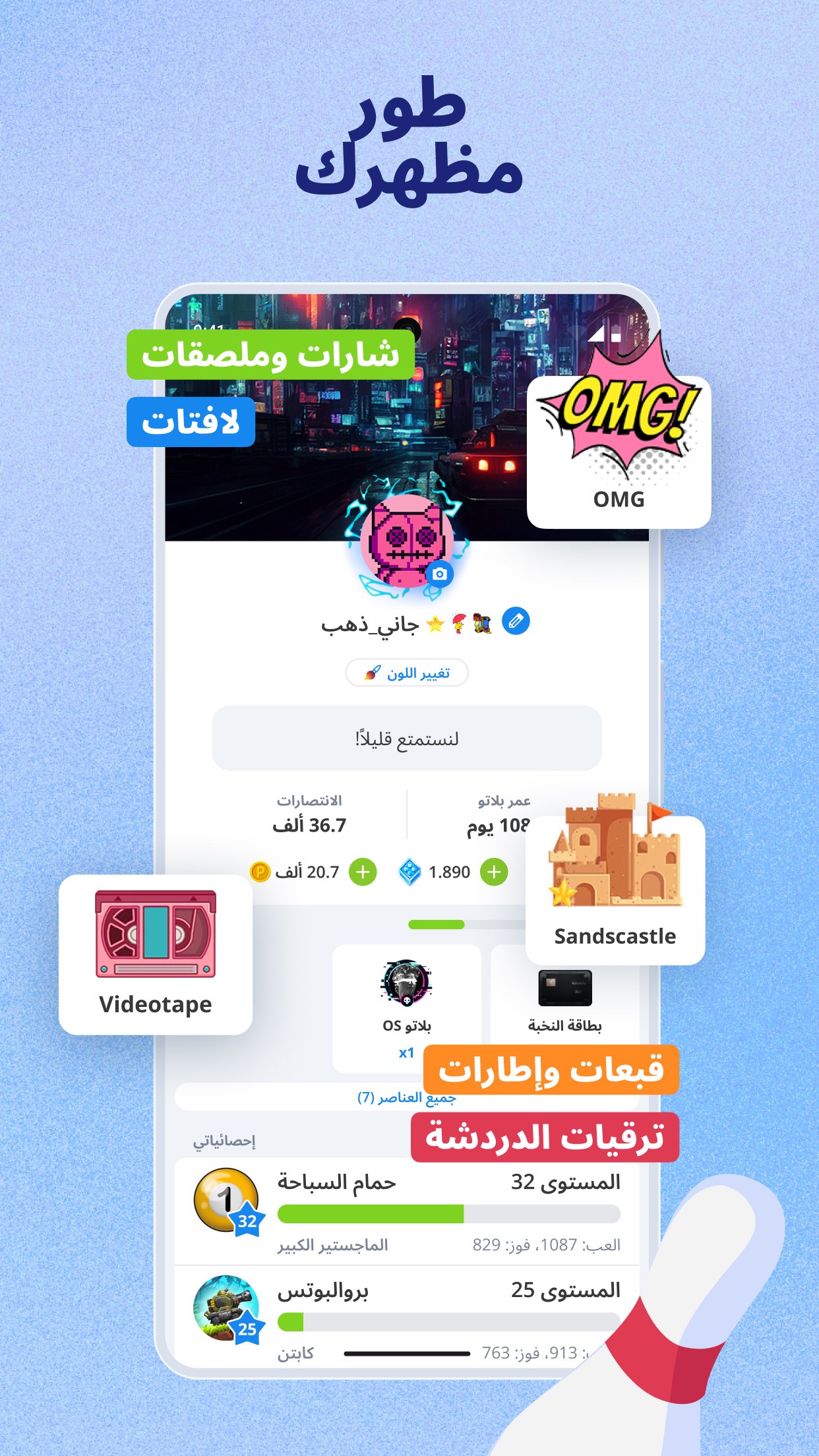 ● جنة التخصيص: قم بتخصيص ملفك الشخصي ونسق الدردشات الجماعية وتجارب الألعاب لتجعل تطبيق بلوتو ملكك حقًا.