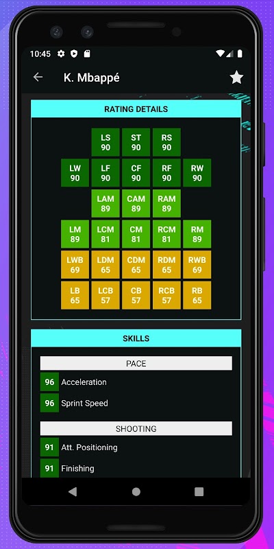 في صفحة تفاصيل اللاعب ، يمكنك عرض بيانات مفصلة للغاية مثل صورة اللاعب ، والاسم الكامل للاعب ، والمواضع المفضلة ، والقدم المفضلة ، وتاريخ الميلاد ، والطول ، والوزن ، وتاريخ انتهاء العقد ، والأجر ، والقيمة ، وشرط الإصدار ، والتخصصات ، والسمات ، والضعف القدم وحركات المهارة ومعدلات العمل والإحصائيات الإجمالية وتقييمات اللاعبين لكل مركز.