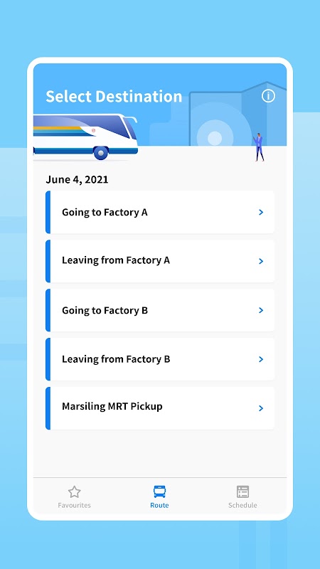 يمكن لأعضاء الفريق الحصول على معلومات سريعة وسهلة عن طرق خدمة الحافلات ، والوصول المحدد ووقت الانتظار المقدر. يتم تقدير مواعيد وصول الحافلات وفقًا لخرائط Google.