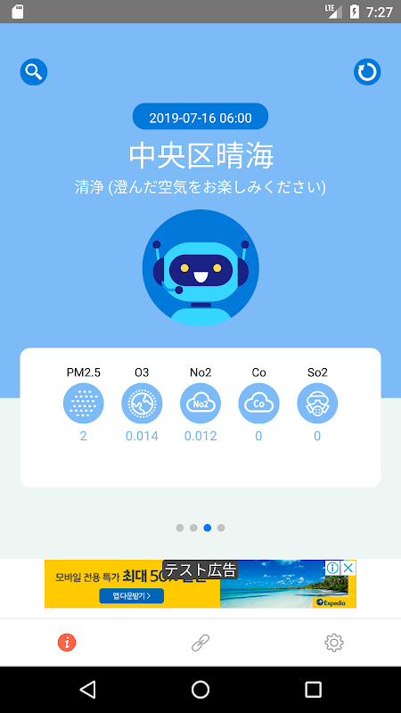 かわいいキャラクターが現在微細粉塵の状態をお知らせします。
