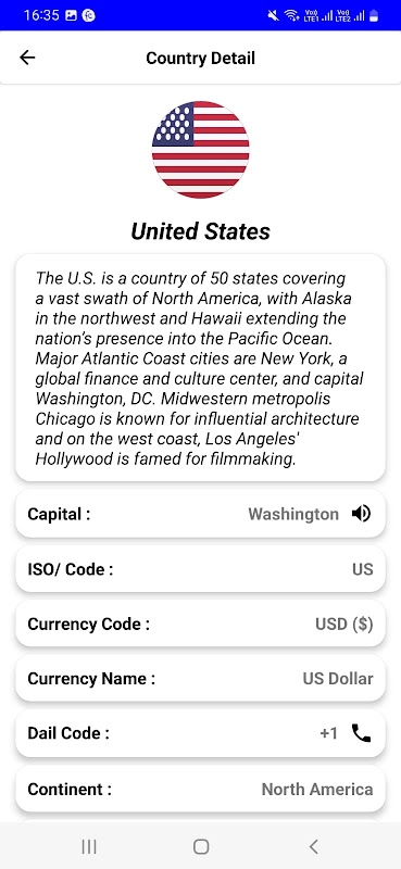 يوفر لك هذا التطبيق معلومات مثل رأس المال ورمز البلد وعاصمة بلد ISO ورمز العملة واسم العملة والقارة واللغة وعلم البلد والبحث الصوتي السريع عن البلد ونطق اسم البلد وما إلى ذلك.