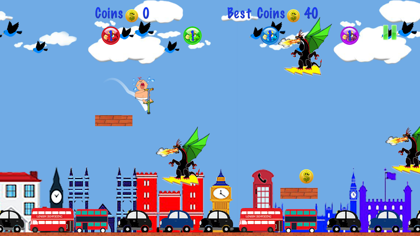 PogoBaby Redux is the revival of PogoBaby for Android. PogoBaby Redux has many more improved power-ups. PogoBaby Redux is fast and fun with entertaining, original artwork and animation. Money-hungry PogoBaby jumps around collecting gold coins, diamonds, rubies, emeralds and much more throughout the game while trying to avoid a horde of monsters and obstacles. Find different colored power-up birds to help gather more loot - The orange bird makes PogoBaby invincible! Just tap the screen to make PogoBaby jump and amass great riches!