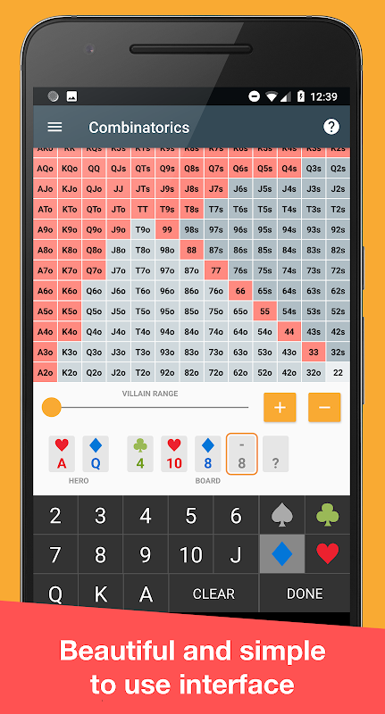 Combinatorics+ is the only app you need to upskill your poker knowledge on hand reading. The app is extremely fast and easy to use poker calculator. Just enter a preflop range, board and/or dead cards to easily figure out how a range hits a board.