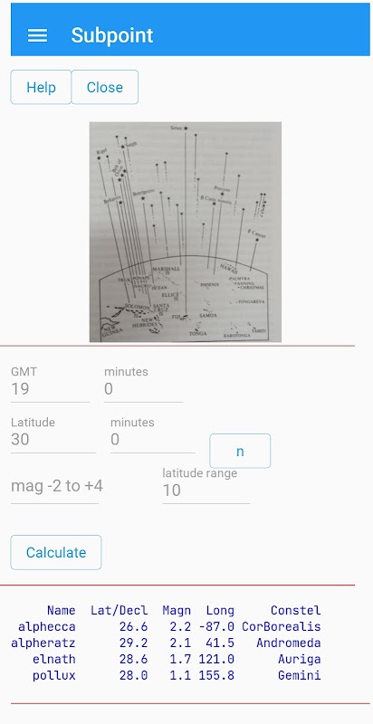 الحساب الثاني هو حساب النقطة الفرعية للنجم. النقطة الفرعية للنجوم هي الموضع المسقط مباشرة أسفل النجم عندما يكون النجم في الأعلى، بحيث يترجم انحرافه والصعود الأيمن إلى خط العرض وخط الطول على التوالي.