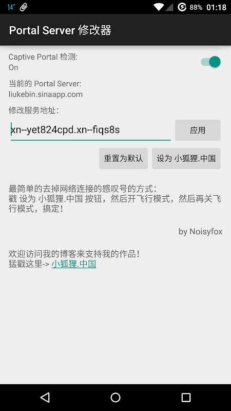 不是每个人都熟悉adb操作,我推荐大家装NoExclamation.apk这个工具来替换掉google.com这个检测地址。我本人是用liukebin.sinaapp.com来替代,liukebin.sinaapp.com架设于国内SAE服务器,国内访问速度快。